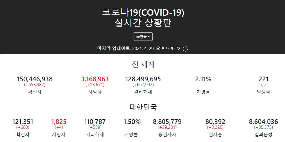 금일 현재 한국의 코로나19 감염확진자는 121,351명(2021년 4월 29일 기준), 사망자는 1,825명입니다. 감염확진자는 세계에서 86번째로 많은 국가로 기록되고 있습니다.