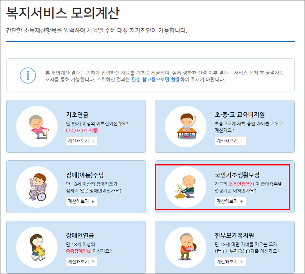 2. 복지서비스 모의 계산의 다양한 메뉴 중 '국민기초생활보장'을 클릭하세요.
