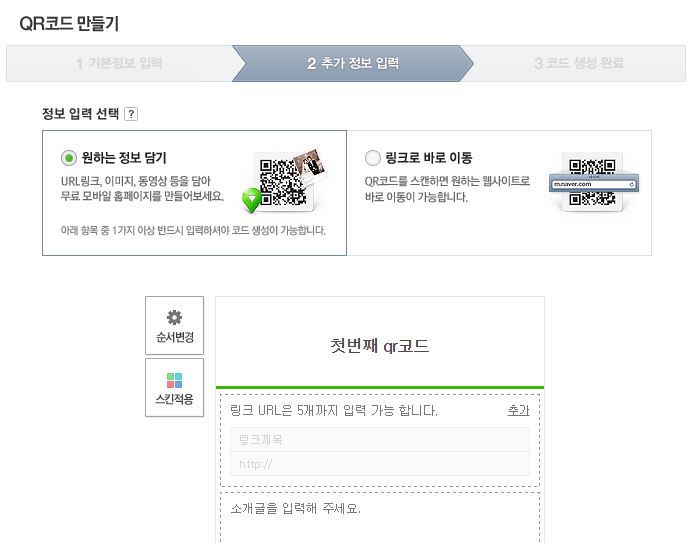7. 다음 메뉴는 추가정보 입력단계입니다. 크게 두가지 형태가 있습니다. 기본값은 '원하는 정보담기'가 있고 다른 하나는 '링크로 바로 이동'입니다.