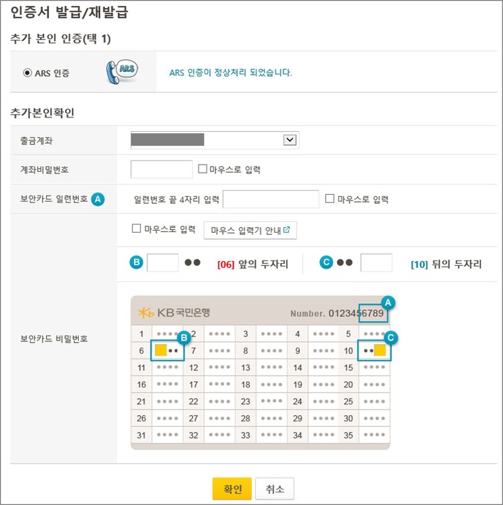 6. ARS인증 완료되면 계좌비번과 보안카드 정보들을 입력하게 됩니다. 이 과정을 통해 현재 인증서 발급받으려는 사람이 이 계좌의 주인임을 확인하게 됩니다. 다 정확하게 입력하고 난 뒤 확인을 누릅니다.