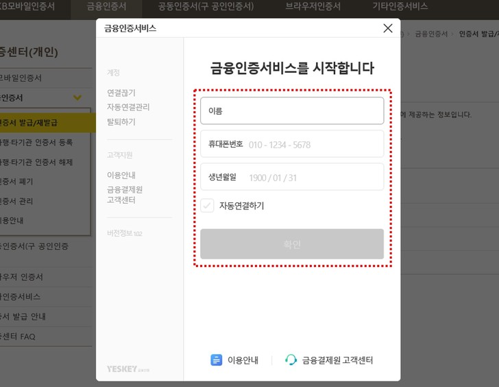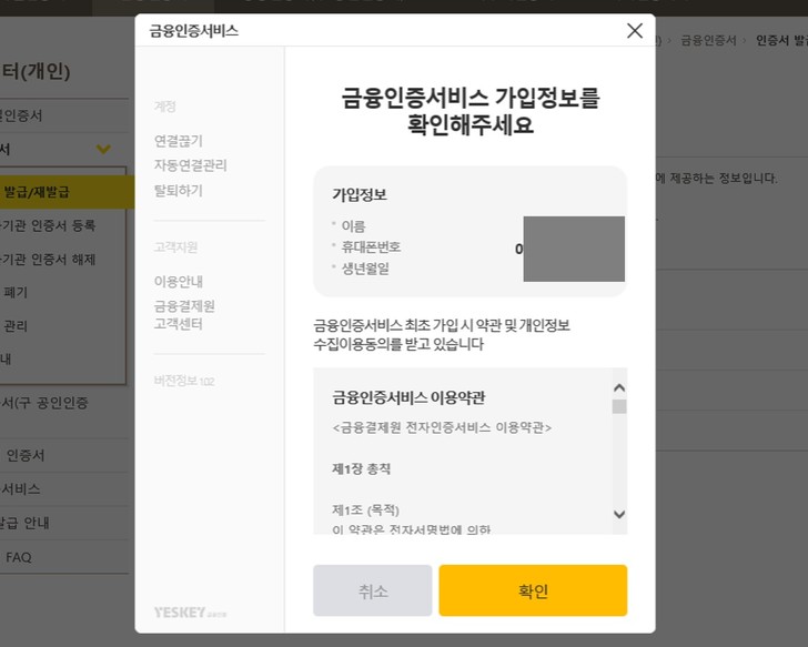 8. 이제야 비로소 금융인증서비스 가입이 시작됩니다. 아래 화면에 보이는 것처럼 이름과 전화번호, 생년월일을 입력한 뒤 확인을 누릅니다.