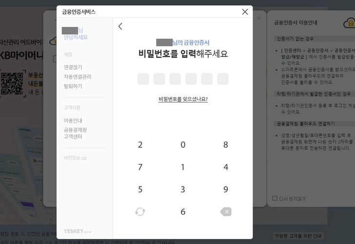 17. 비밀번호 입력하라고 나옵니다. 앞서 금융인증서 개설할 때 비번 설정했었죠? 6자리 숫자. 그걸 입력하면 로그인이 완료됩니다.