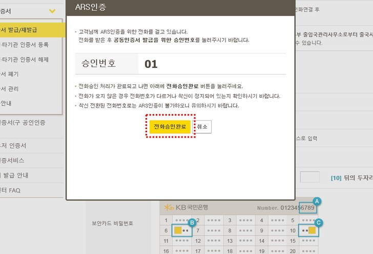 5. ARS인증으로 전화가 오게 되고 화면에는 인증번호가 뜹니다. 전화로 인증번호를 입력하라고 하면 모니터에 보이는 저 인증번호(저의 경우에는 01) 두자리를 입력해야 합니다. 완료되면 전화승인완료 버튼을 클릭합니다.