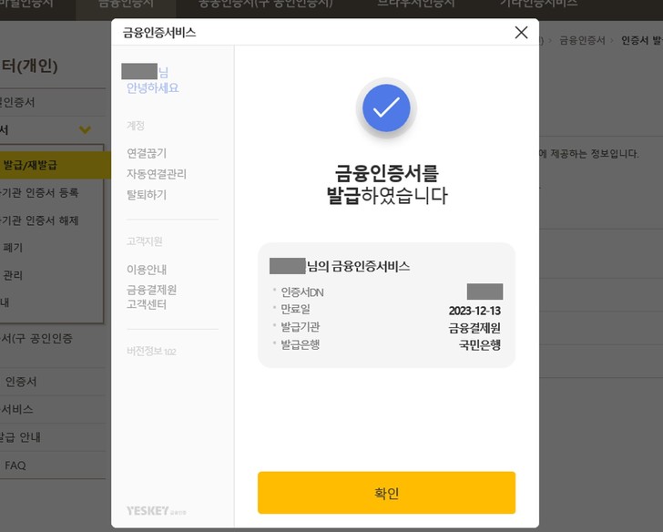 13. 아래와 같이 금융인증서를 발급했다는 화면이 뜹니다.(이제 다 했습니다.)