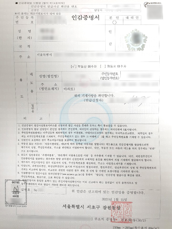 사실 인감증명서 발급받으러 갈때 매수자 정보가 필요하다는 것을 생각하지 못했었습니다. 부동산 매매를 위한 인감증명서 발급받으려는 분들은 꼭 매수자 정보가 나온 계약서를 사진으로 찍어 가져가세요. 반드시 필요합니다.