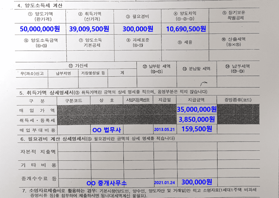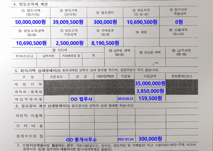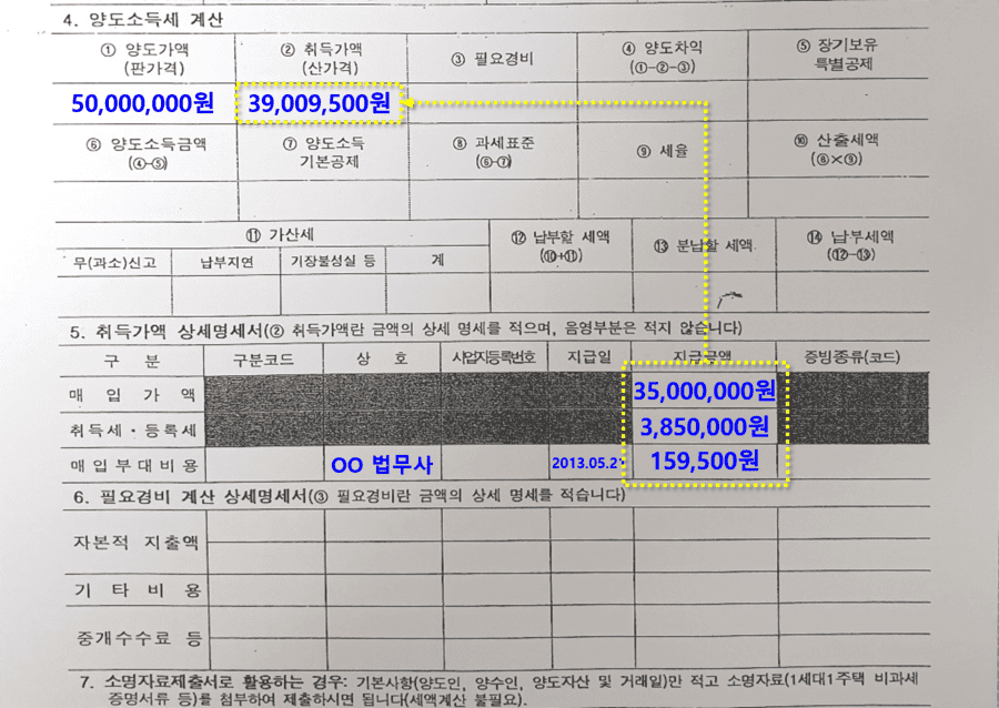 취득가액은 매도한 부동산을 얼마에 산 건지를 표시하는 것으로 단순히 아파트 가격만을 이야기 하는건 아니더라구요. '5번 취득가액 상세명세서'의 합계 금액을 입력해야 합니다. 만일 아파트를 7천만원에 구입했던 것이라면 공동명의 비율에 맞게 매입가액에 50%인 35,000,000원을 기입하고 취득세, 부대비용을 모두 더해서 취득가액을 입력합니다. 아래 그림을 확인해 보세요.