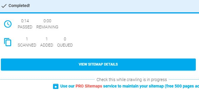 페이지 양에 따라 시간이 좀 걸립니다. 수초~수분의 시간이 흐른 뒤 사이트의 링크들을 분석하고 난 다음, 완료되면 VIEW SITEMAP DETAILS를 클릭합니다.