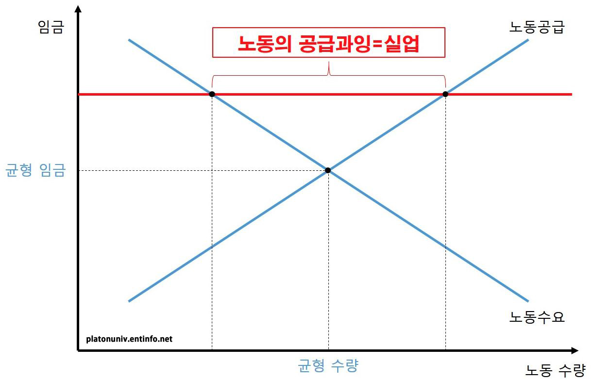 시장의 '보이지 않는 손'이 알아서 적당한 노동력의 가격을 갖게 하지 않고 인위적으로 시장 개입을 통해 가격을 올리게 되면 노동시장에서는 노동력 과잉 현상이 발생하게 됩니다. 그러면 일부 근로자들은 직업을 갖지 못하고 실업상태가 됩니다. 실업률이 올라가게 되는 것이죠.