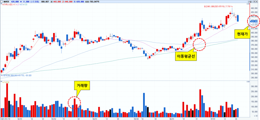 주식차트를 본다는 것은 그 안에 숨은 의미를 확인한다는 것인데요. 주식의 정보를 알아보는 여러가지 지표들이 있지만 그래프에서 확인할 수 있는 내용 중 꼭 봐야 할 것들은 아래와 같습니다.