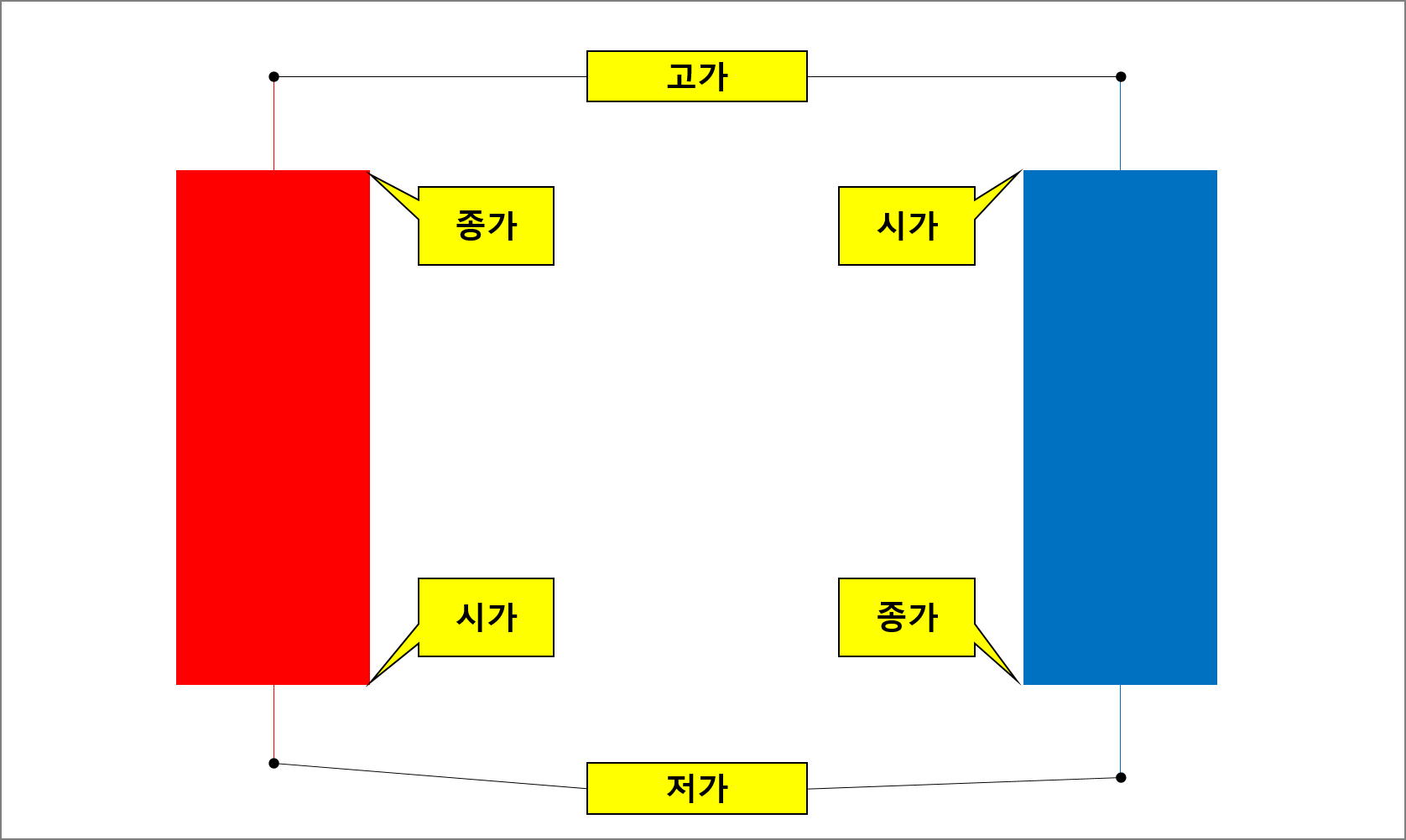 캔들차트의 4가지 정보(시가, 종가, 고가, 저가)가 막대 하나로 다 표현되는데 양봉(이전 대비 상승)과 음봉(이전 대비 하락)에서 시가, 종가가 반대입니다. 아래 그림으로 설명해 두었습니다.