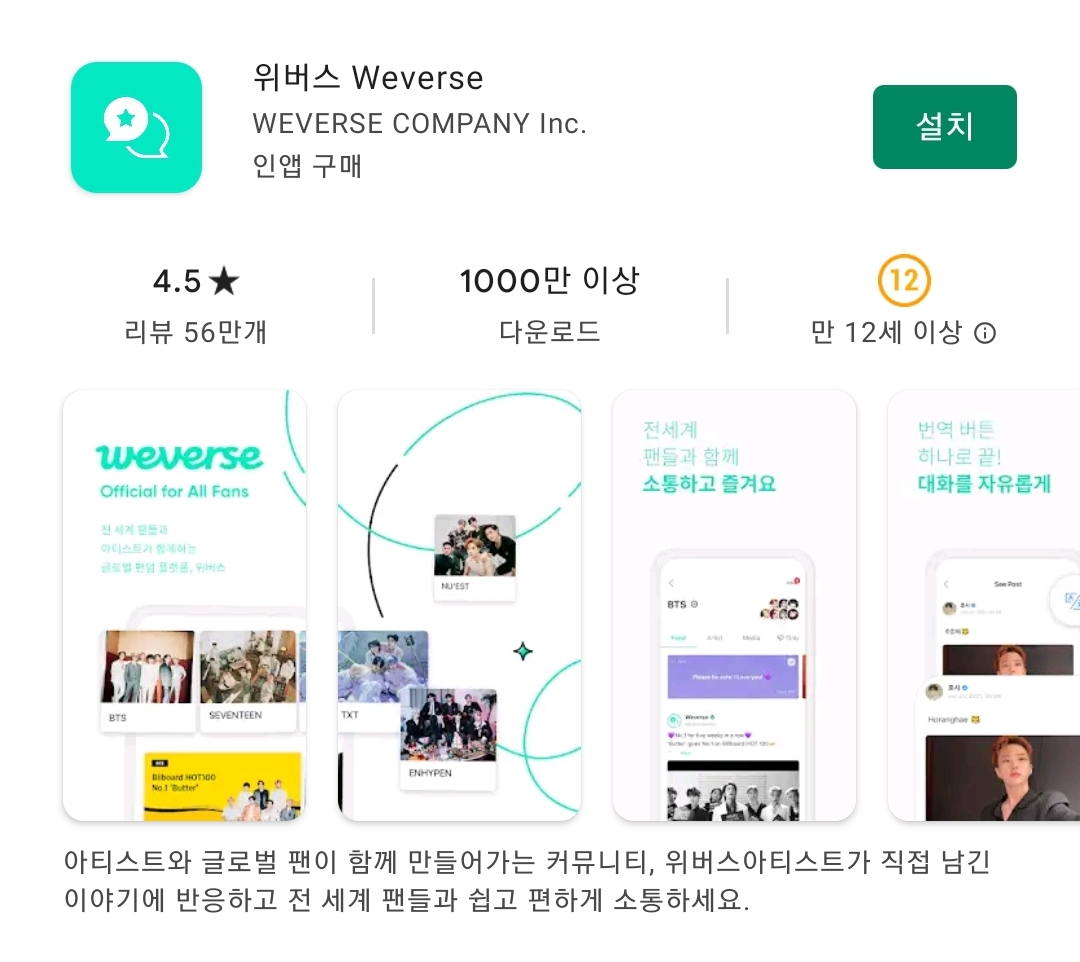 이 외에도 위버스(weverse) 어플도 함께 다운 받으시기 바랍니다. 위버스 앱은 글로벌 팬덤 플랫폼입니다. 아티스트와 팬이 함께 소통하는 장소입니다.