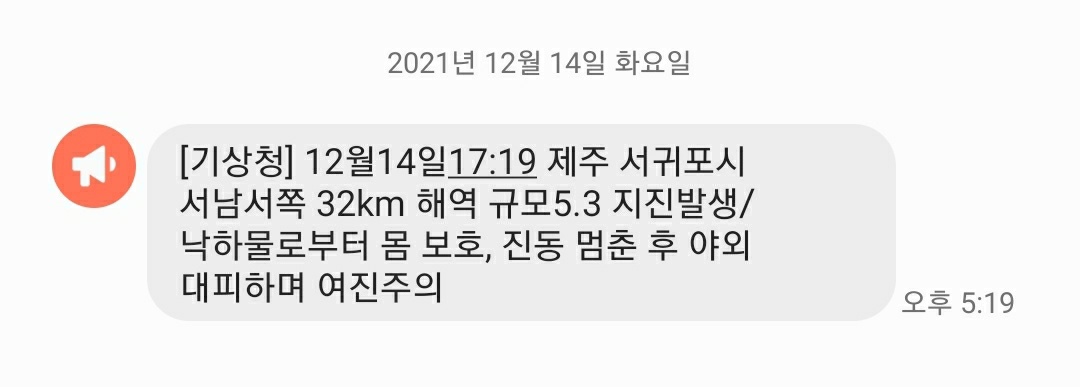 기상청에서는 오후 17시 19분 제주 서귀포시 서남서쪽 32km 해역에서 규모 5.3의 지진이 발생했다고 경보를 알려왔습니다. 육지에서 상당히 가까운 지역에서 지진이 발생하였습니다.