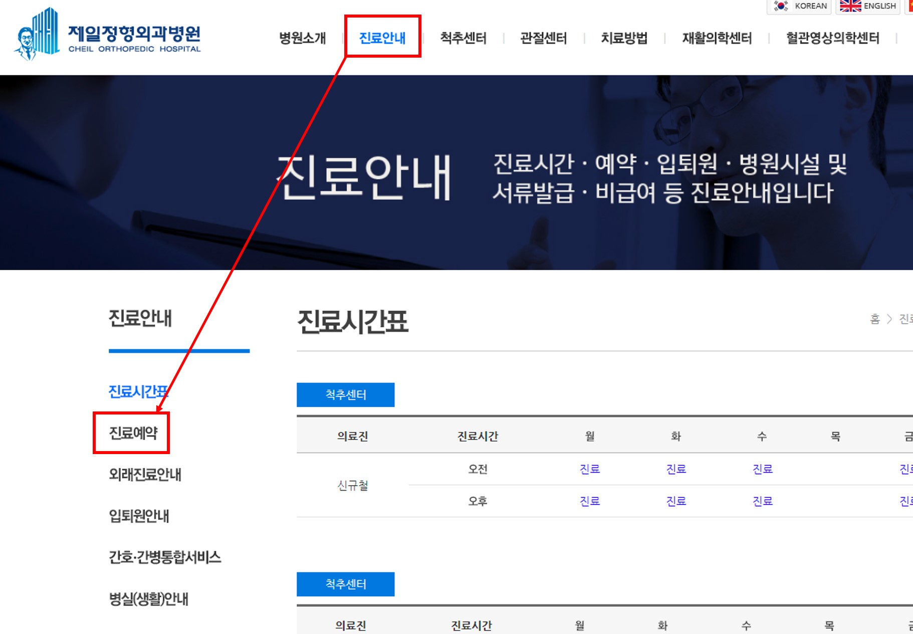 (1) 제일정형외과병원 사이트에 접속하세요. 아래 링크로 방문하면 바로 예약 사이트로 들어갑니다.