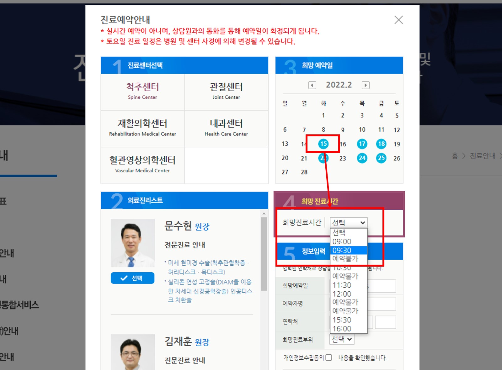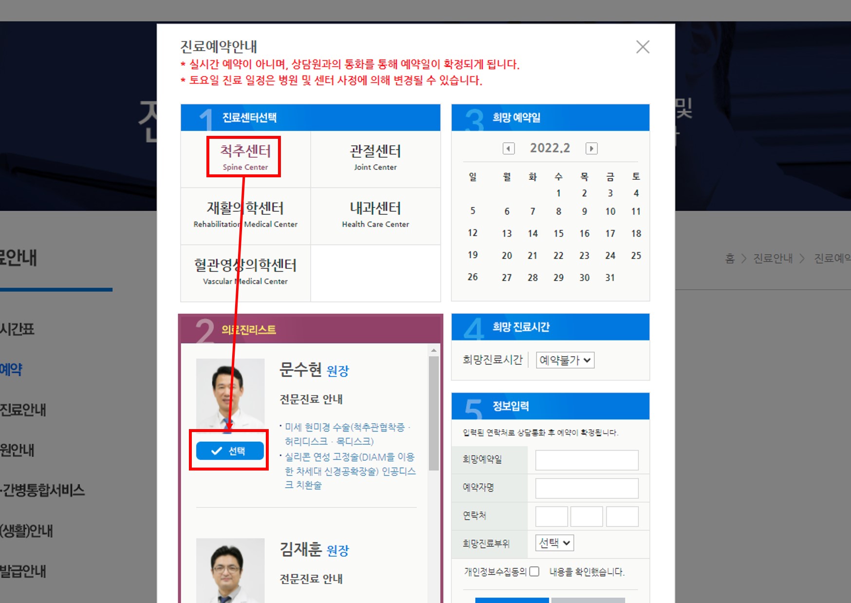 (3) 진료 받고 싶은 과와 원장님을 선택합니다.(아래 예시는 척추센터를 예시로 하였습니다.)