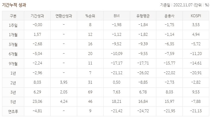 주식 투자 비율이 높다보니 경기 침체 상황에서 큰 수익을 보기는 어렵지만 경기가 회복 국면으로 들어가거나 미국 금리 상승 속도가 완화된다면 좋은 성과를 기대해볼 수 있을 듯 합니다.