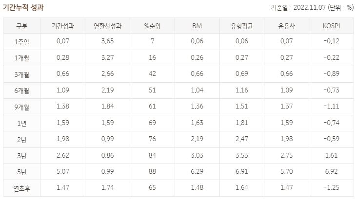 이 펀드는 다른 유형 평균과 비슷한 수익률을 기록하고 있습니다. 최근 1년 누적 수익률은 1.59%입니다. 다만 최근에 금리가 상승하고 있는 추세기 때문에 시간이 지날 수록 투자 수익률은 높아질 것으로 예측됩니다.