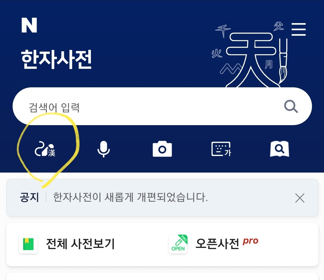 다음 한자를 직접 써서 입력할 수 있는 한자 필기인식기를 클릭합니다. 아래 이미지는 모바일 기준입니다. PC에서는 입력창에 펜 모양 아이콘이 있습니다.