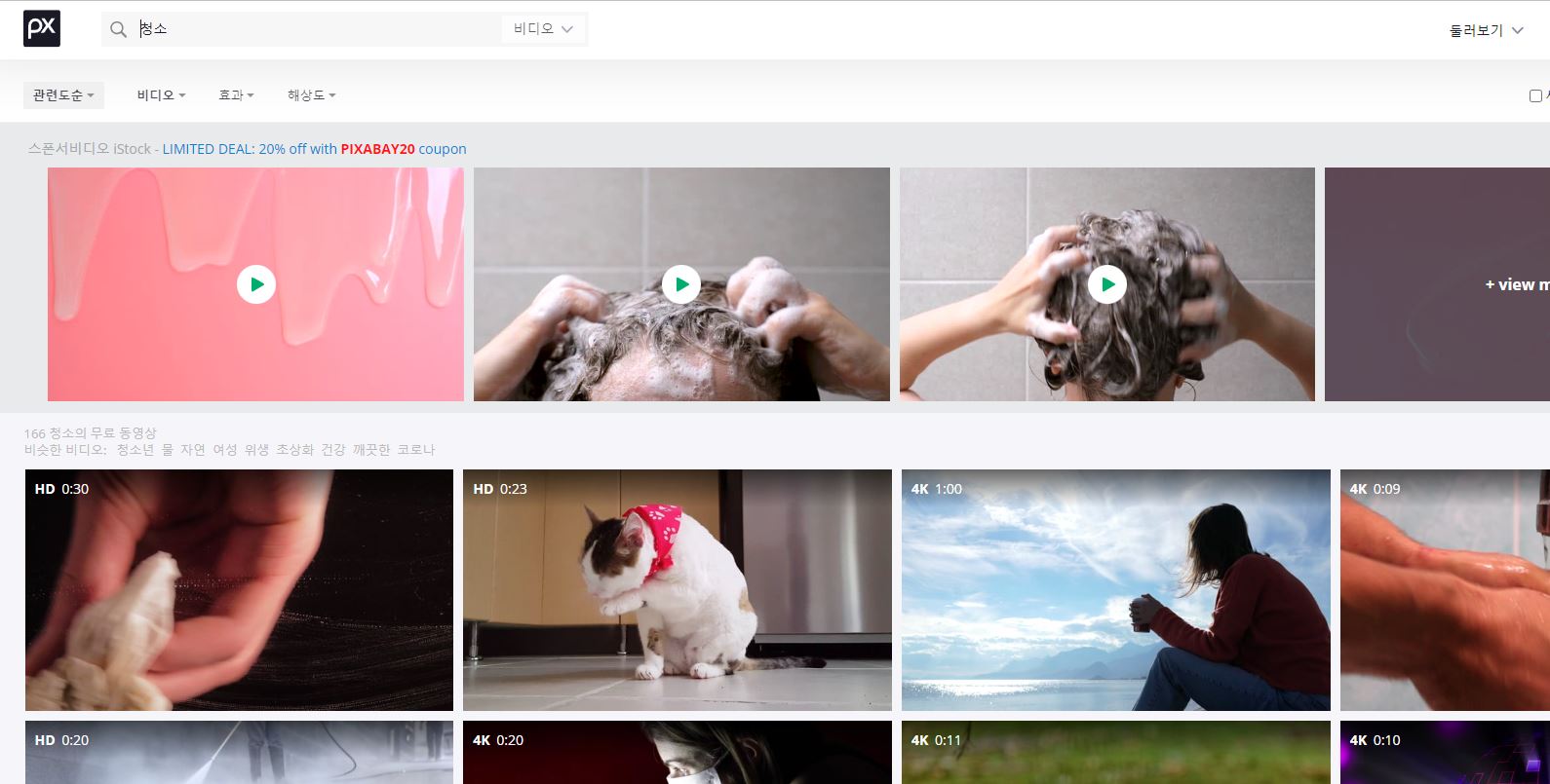 아래와 같이 '청소'라는 키워드로 비디오를 검색하니 HD, 4K급의 영상들이 많이 검색되고 있습니다. 맨 위 스폰서 비디오를 제외하고는 무료로 이용할 수 있는 무료 동영상입니다.