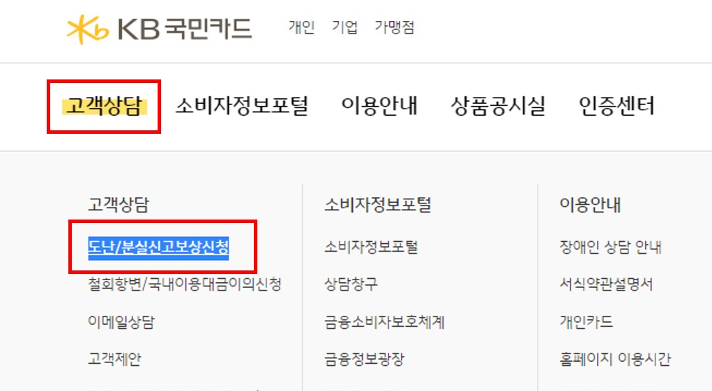 고객센터 메인 메뉴 중 고객상담 > 도난/분실신고보상신청으로 이동합니다. 아래 그림처럼 메뉴를 확인해 보세요.