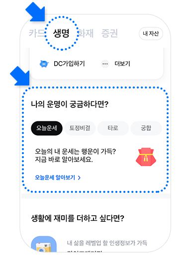 삼성금융 통합 앱인 모니모를 설치한 후에 회원가입을 해야 합니다. 앱 하단 메뉴에서 '마이'를 선택합니다. 상단 메뉴에서 '생명'을 클릭하면 아래에 '운세' 메뉴를 확인할 수 있어요.